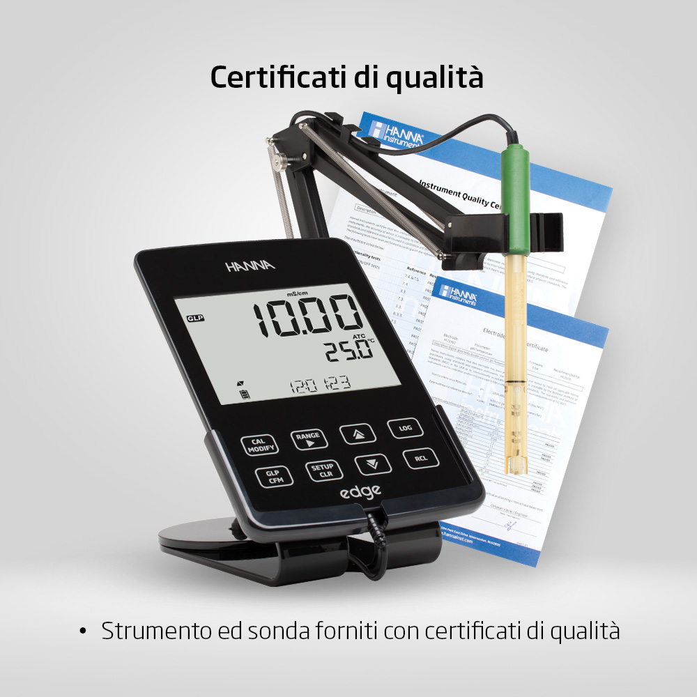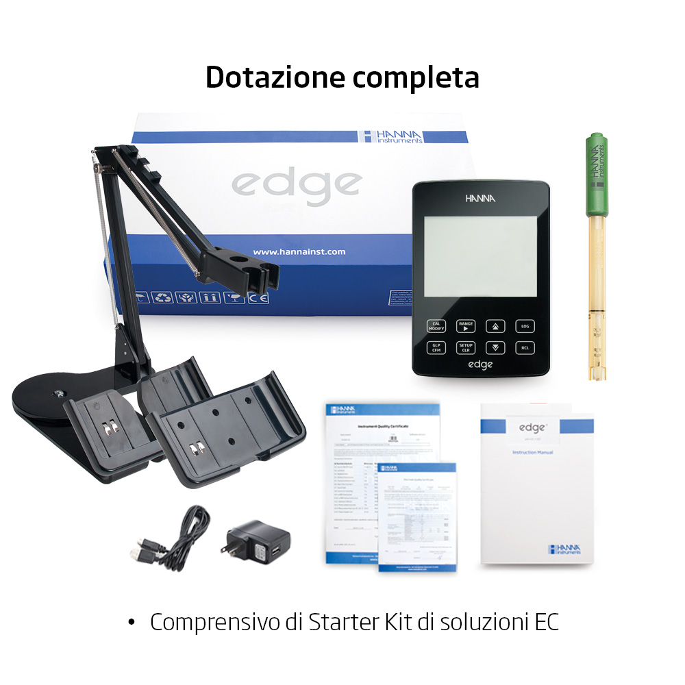 | Informazioni Ordine | edge® HI2030-02 kit EC è fornito completo di supporto da banco con stativo portaelettrodo, supporto da parete, sonda EC HI763100, soluzioni di calibrazione a 1413 µS/cm (4 bustine), a 12880 µS/cm (2 bustine) e a 5000 µS/cm (2 bustine), soluzione di risciacquo sonda, cavo USB, adattatore corrente, certificato di qualità, manuale. |