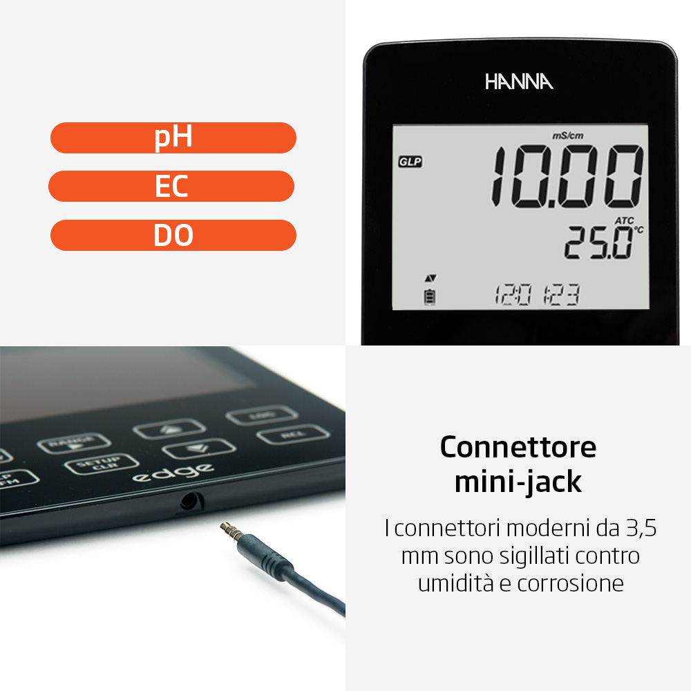 HI2030 edge kit EC è inoltre uno strumento multiparametro: oltre alla sonda di conducibilità in dotazione è infatti possibile collegare un elettrodo pH o la sonda per ossigeno disciolto.