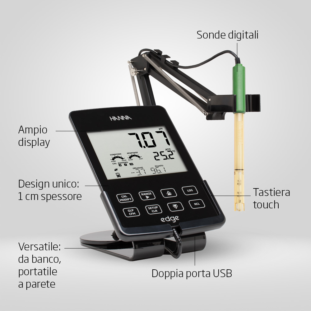 Il design versatile e lo spessore di 1 cm permettono di utilizzare il pHmetro in modi e ambienti diversi, senza occupare lo spazio di un tradizionale strumento da banco.