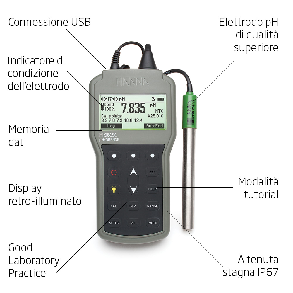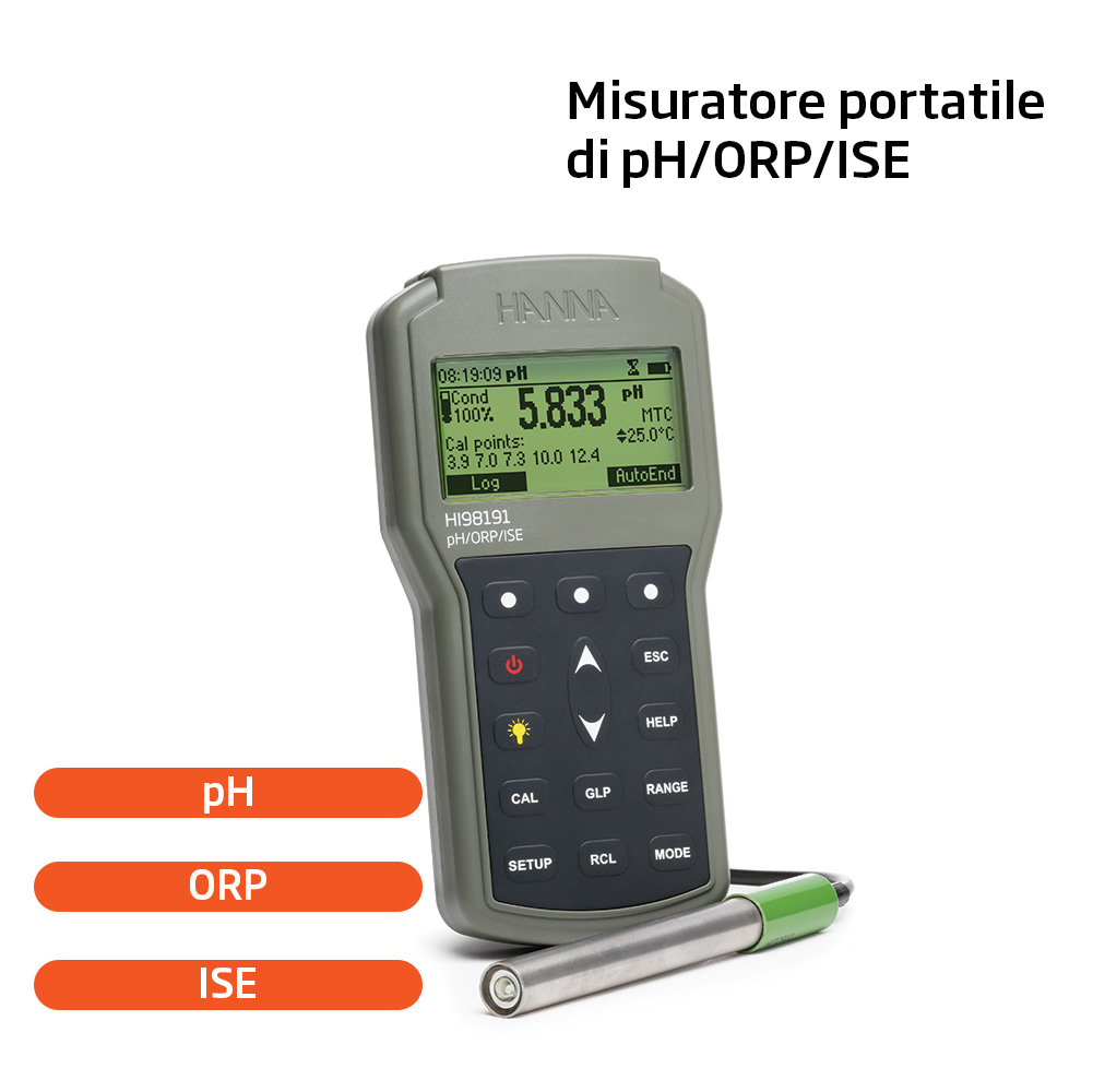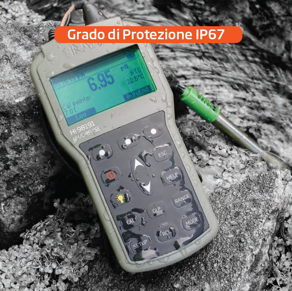 HI98191 è un pHmetro portatile professionale per usi generali e analisi delle acque. Progettato per offrire la massima praticità e robustezza per le analisi di pH/ORP/ISE. Con un design portatile e resistente, questo strumento di misura vi consentirà di effettuare analisi accurate e affidabili ovunque e in qualsiasi momento.