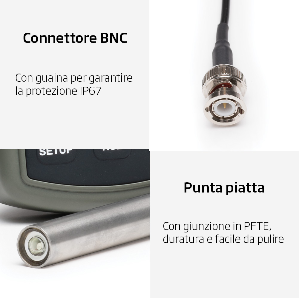 L’elettrodo pH ha un corpo in titanio resistente alle sostanze chimiche aggressive e praticamente indistruttibile. Il sensore di temperatura è incorporato nella punta dell’elettrodo.