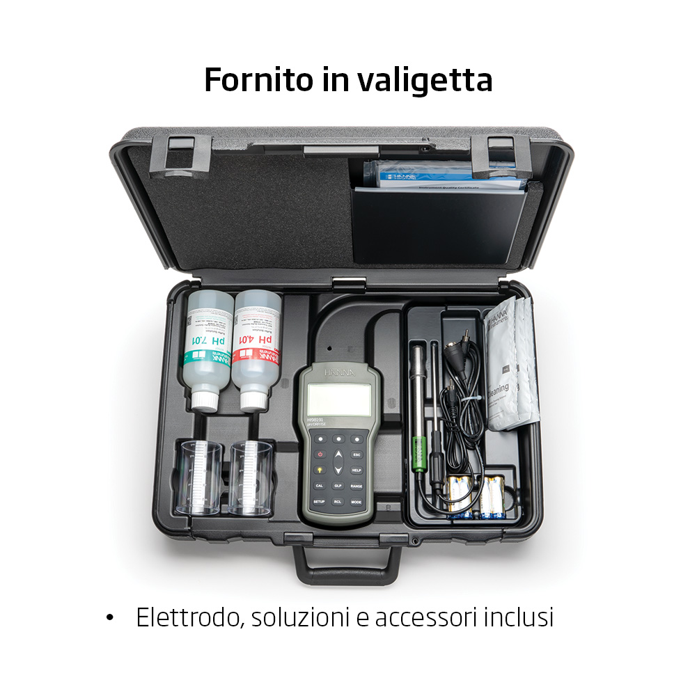 HI98191-02 è fornito con elettrodo pH con corpo in titanio HI72911B, soluzione di calibrazione pH 4.01 HI7004M (230 mL), soluzione di calibrazione pH 7.01 HI7007M (230 mL), soluzione di pulizia in bustina HI700601 (2 x 20 mL), beaker di plastica da 100 mL (2), batterie 1.5V AA (4), software PC HI92000, cavo micro USB HI920015, manuale di istruzioni, guida rapida di riferimento, certificato di qualità strumento e valigetta rigida HI720191.