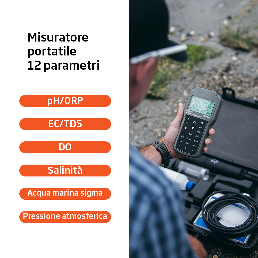 HI98494 è un misuratore multiparametro portatile a tenuta stagna, che monitora fino a 12 diversi parametri per la qualità dell'acqua. La sonda multisensore è dotata di microprocessore e consente la misurazione di parametri chiave, tra cui pH, redox, conducibilità, ossigeno disciolto e temperatura. La sonda trasmette le letture digitalmente allo strumento, che consente di visualizzare e salvare i dati. I dati registrati nello strumento possono essere trasferiti tramite Bluetooth® a un dispositivo in cui è installata l'app gratuita Hanna Lab. HI98494 viene fornito con tutti gli accessori necessari, in in una robusta valigetta per il trasporto e l'uso sul campo.