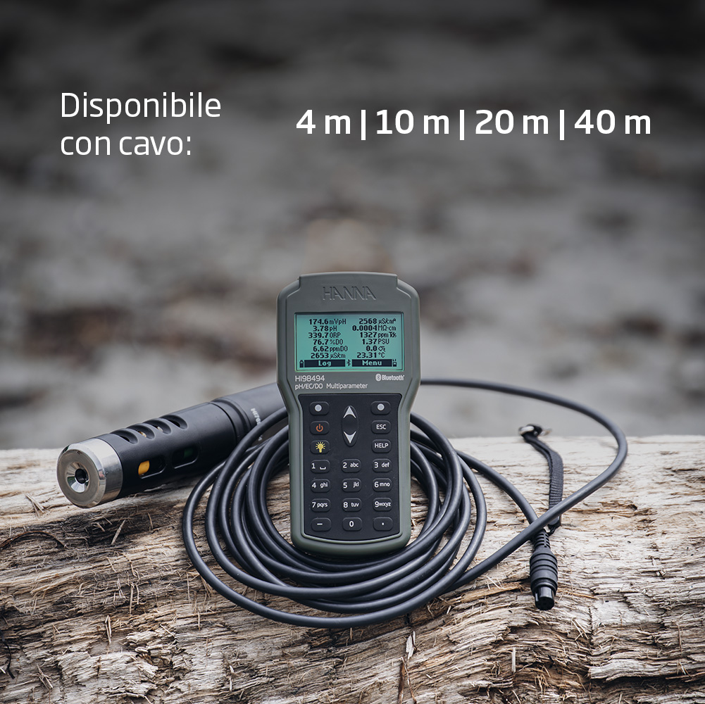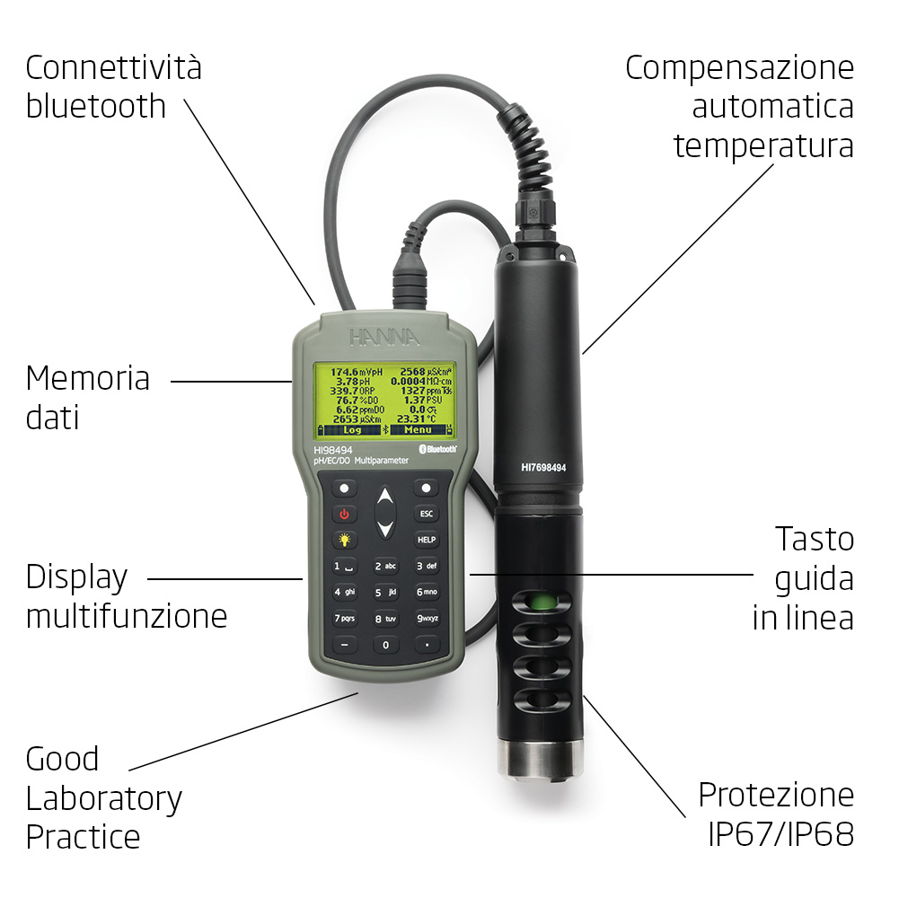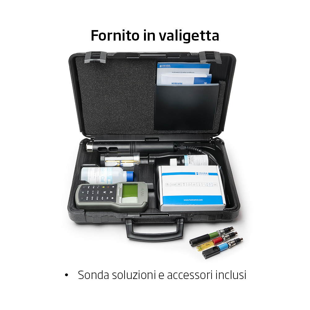 Sì, assolutamente. La multiparametrica HI98494 è dotata di tecnologia Bluetooth® Low Energy (BLE) integrata. Questa funzionalità le permette di connettere lo strumento in modalità wireless a uno smartphone o tablet (compatibile con dispositivi iOS e Android) su cui è installata l'app Hanna Lab.