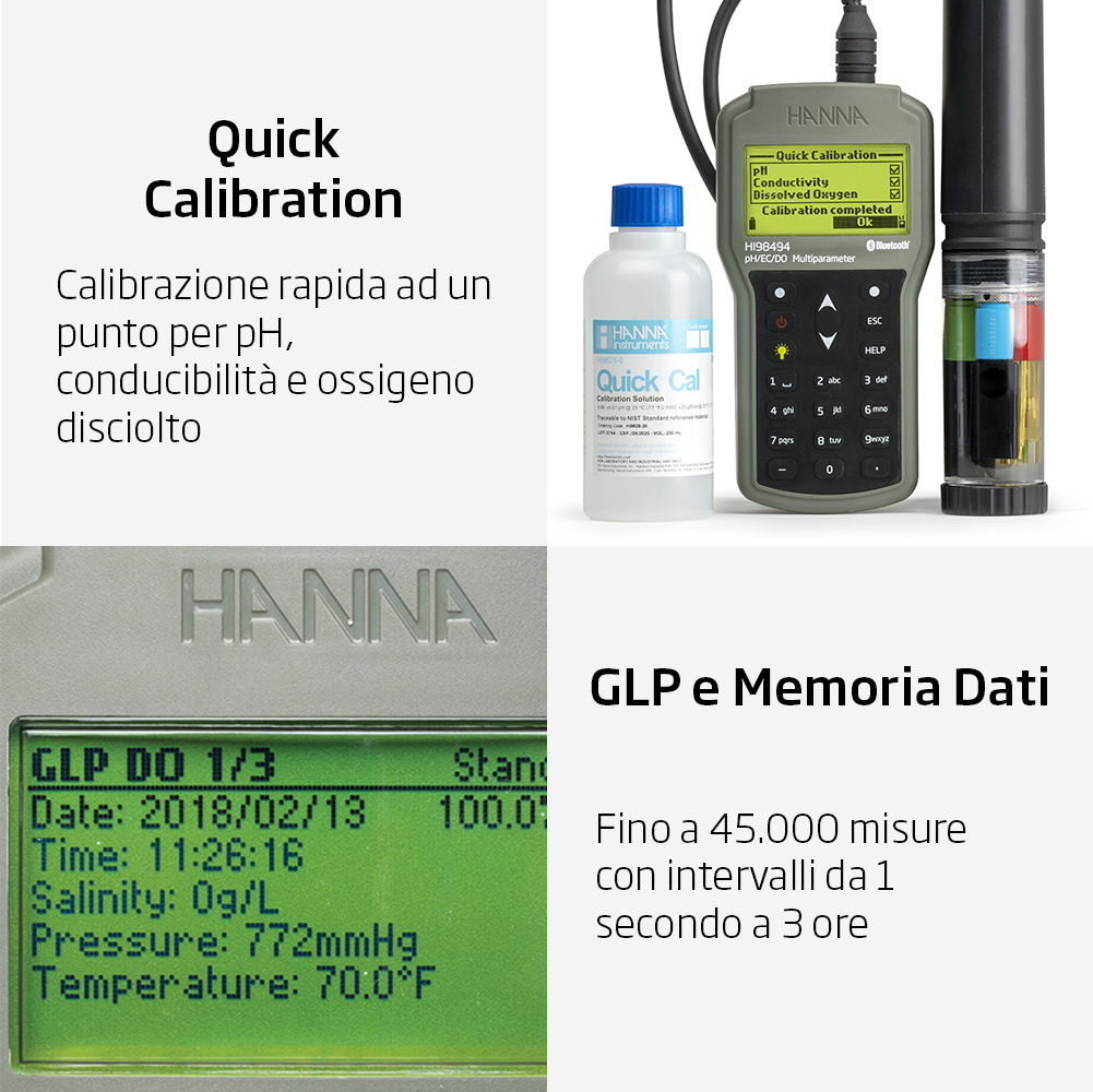 Il HI98494 è dotato di funzionalità GLP (Good Laboratory Practice) avanzate per garantire la tracciabilità e la documentazione delle sue calibrazioni, un requisito fondamentale in molti ambienti di laboratorio e di controllo qualità.
