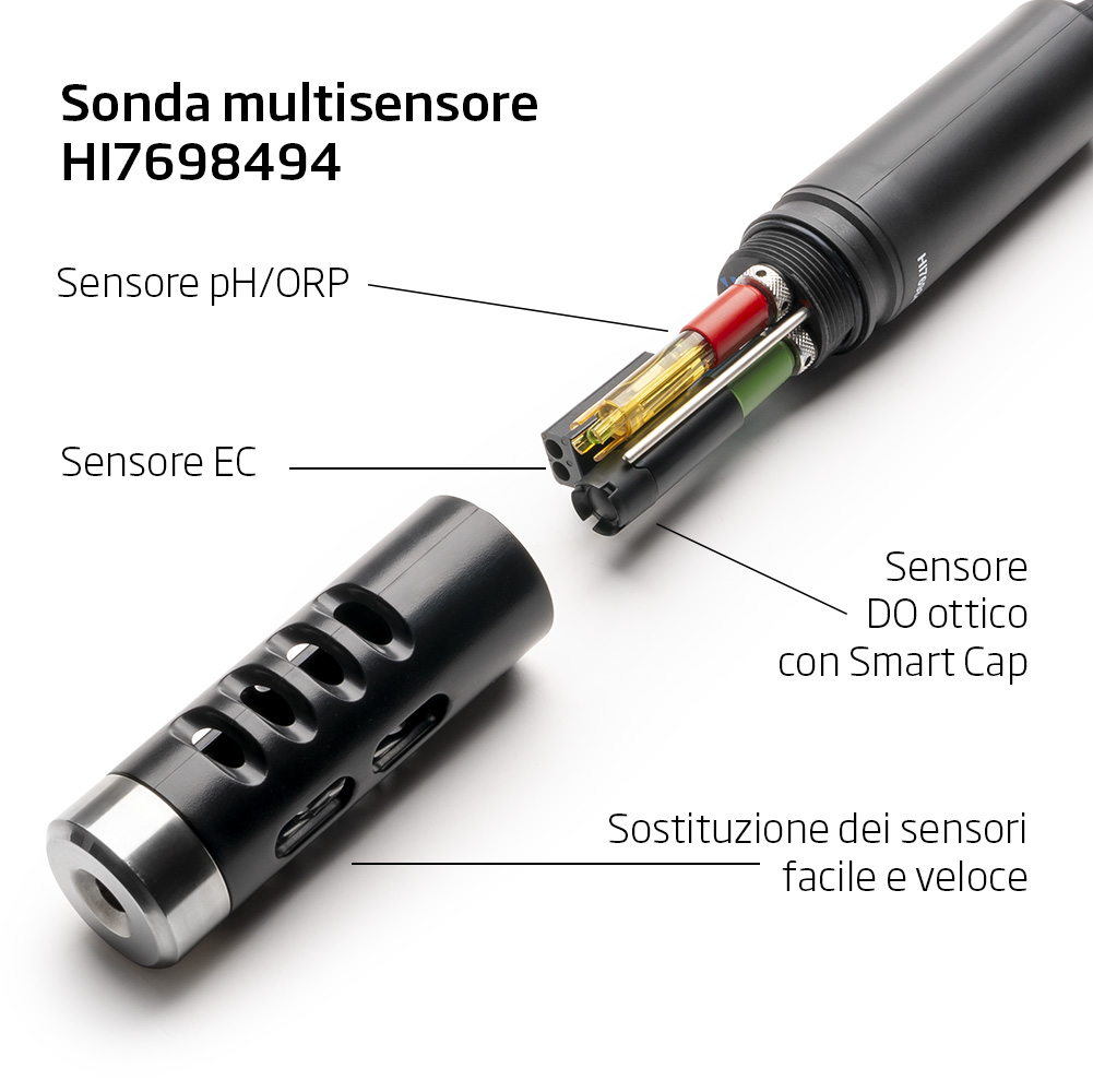 La sonda multisensore della HI98494 è progettata per misurare fino a cinque parametri chiave contemporaneamente con un'unica immersione. Questi includono: