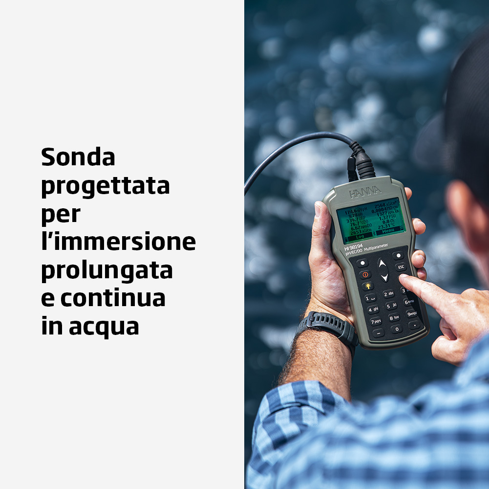 Pertanto, può tranquillamente utilizzare il HI98494 in ambienti umidi e persino in caso di cadute accidentali in acqua, e la sonda è pensata per il monitoraggio sommerso continuo.