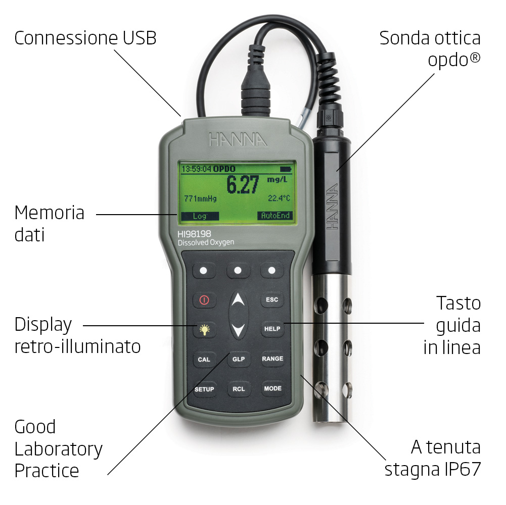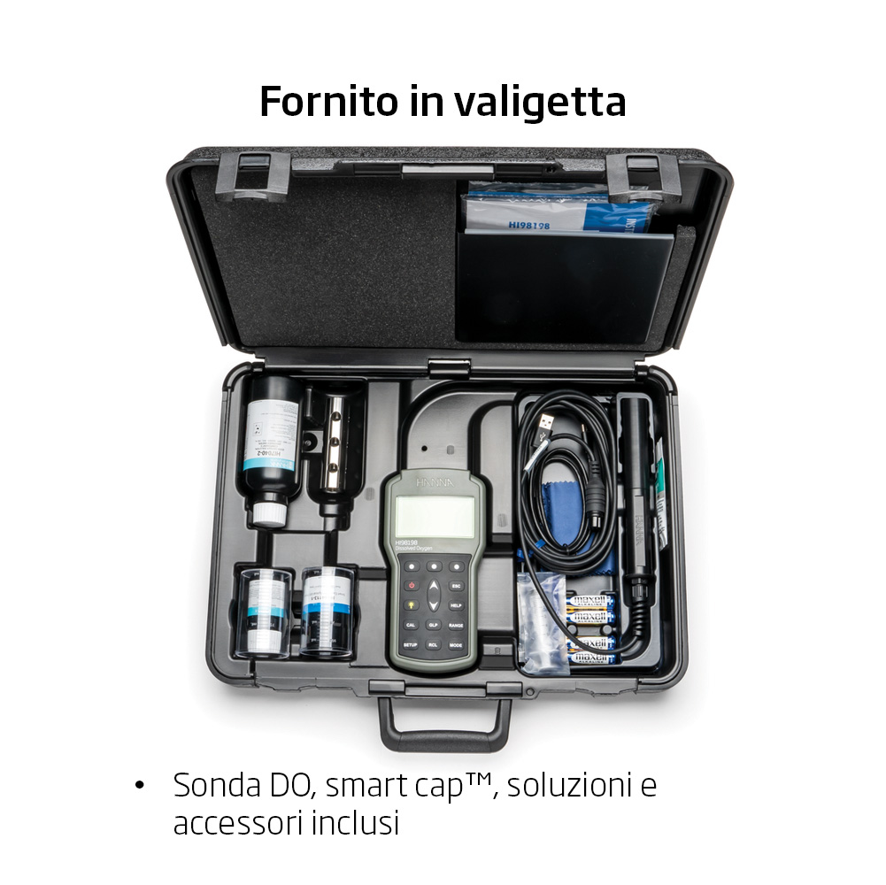 Informazioni Ordine HI98198 è fornito con sonda digitale ottica LDO HI764113 (4 m   di cavo) con cappuccio di protezione, Smart Cap™ con o-ring, soluzione di   calibrazione a zero ossigeno HI7040 a bicomponente (230 ml + 30 ml), siringa   con grasso siliconico, beaker da 100 ml (2 pz), panno per pulizia della   lente, cavo USB Tipo-C (1.8 m), 4 batterie AA da 1.5V, certificati di   qualità, manuale di istruzione, valigetta. La sonda è disponibile anche con   cavo lungo 10 m (HI764113/10) o 20 m (HI764113/20).