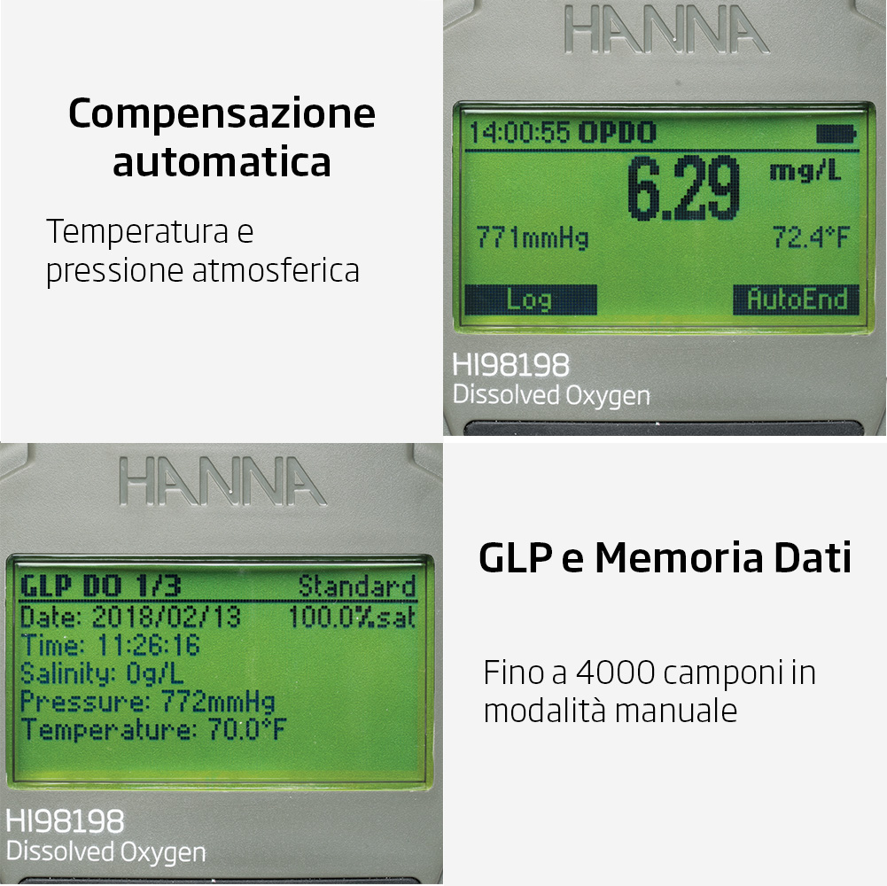 • Compensazione automatica della pressione atmosferica: La pressione atmosferica influenza direttamente la quantità di ossigeno disciolto nell'acqua. Il misuratore HI98198 è dotato di un barometro integrato che misura la pressione atmosferica e compensa automaticamente la lettura dell'ossigeno disciolto in base a questa variabile. Questa funzione è particolarmente utile per le misurazioni in siti con altitudini variabili.