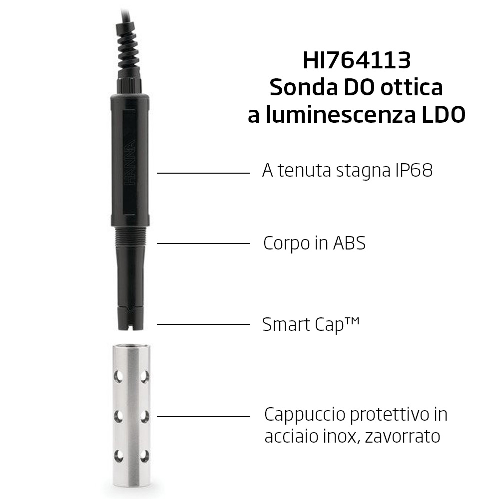 Sonda HI764113 sonda ottica   LDO a luminiscenza, digitale, con cappuccio di protezione zavorrato in   acciaio inox AISI 316, sensore di temperatura interno, connettore Quick DIN e   4m di cavo (inclusa)