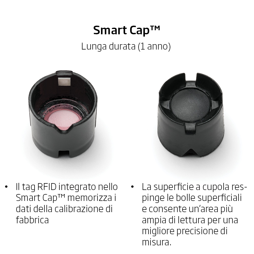 Frequenza di sostituzione: Grazie alla sua pre-calibrazione di fabbrica e alla sua stabilità, il cappuccio Smart Cap™ deve essere sostituito solo una volta all'anno o al massimo ogni due anni (a seconda dell'intensità di utilizzo). Il misuratore tiene traccia del tempo di utilizzo del cappuccio e avviserà l'utente quando è necessaria la sostituzione. Questa rara necessità di sostituzione semplifica ulteriormente la manutenzione e assicura prestazioni ottimali nel tempo.